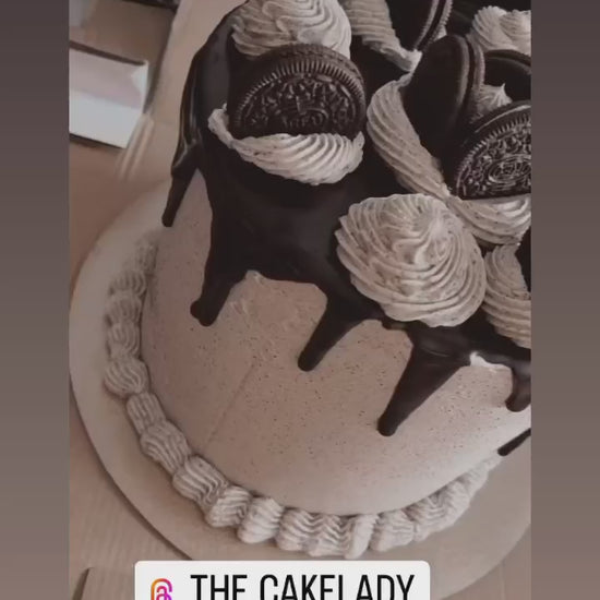 - Chocolate cake layers filled and topped with cookies & cream buttercream and Oreos.